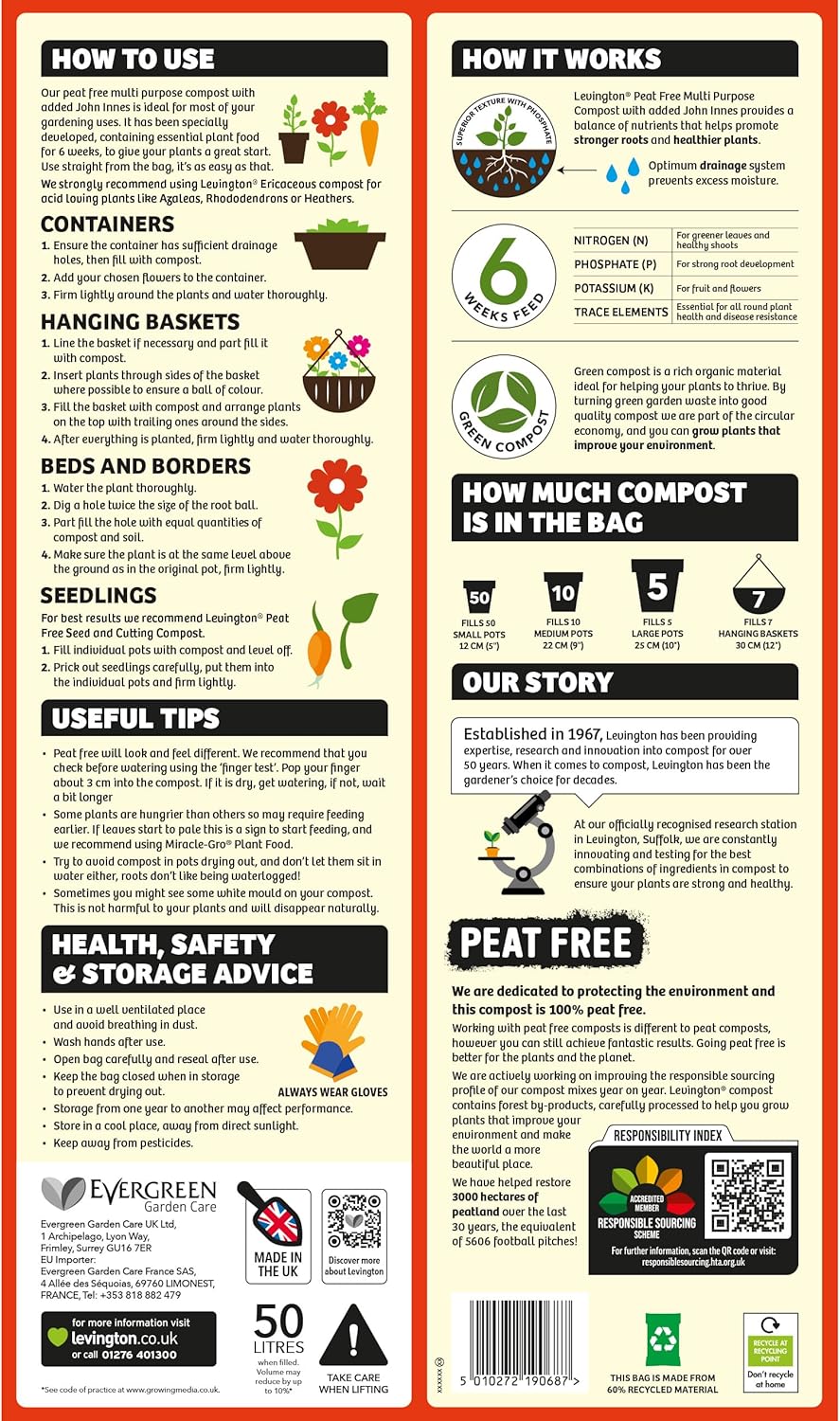 - Peat-free: contains green compost adds minerals and organic matter to the mix, together with useful nutrients derived from recycled vegetation